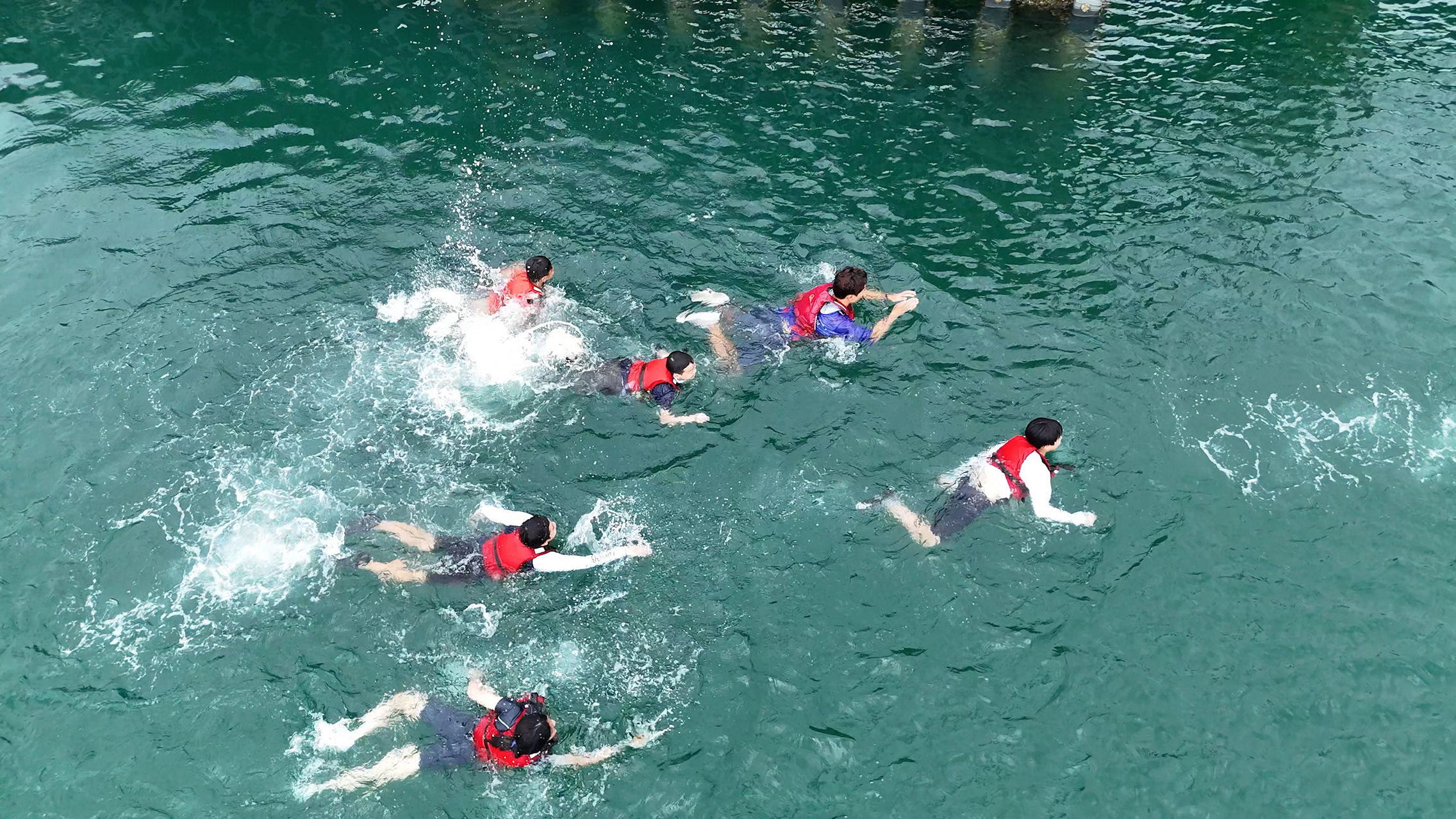 One of the most thrilling parts of the camp was an exhilarating session of water activity. Gathered on a sturdy pier and clad in life jackets, the students prepared for a supervised jump into the sea. This activity served as a powerful metaphor for overcoming personal barriers. By successfully completing the jump, students experienced an immediate boost in self-confidence and learned to manage fear in a controlled environment. The triumphant smiles seen immediately after the splash confirmed the positive impact of facing and conquering a physical challenge.