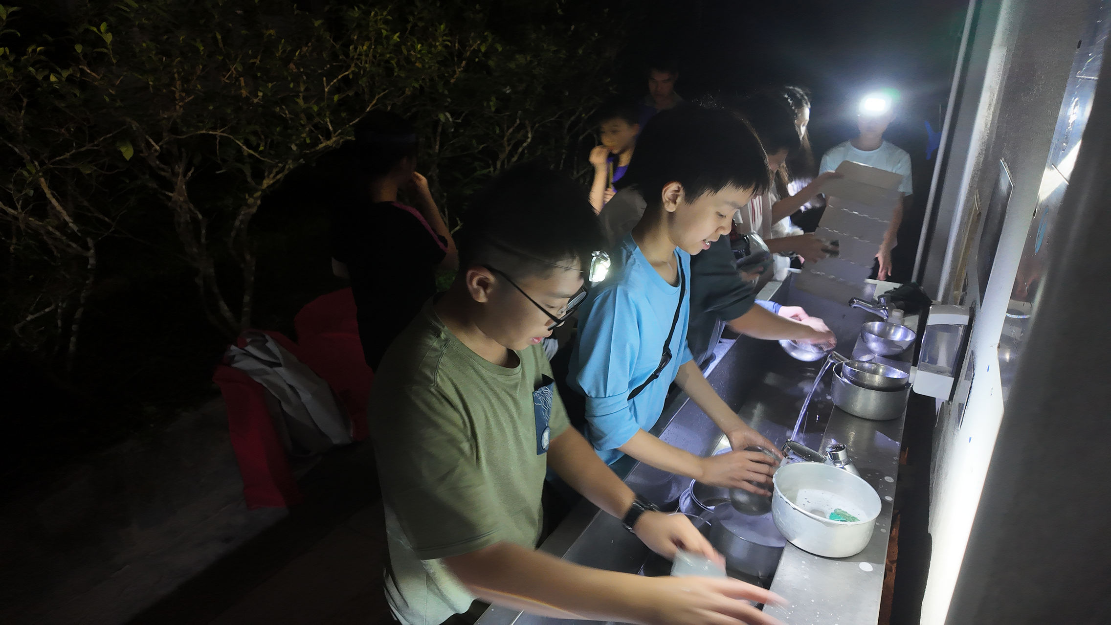 Students were also responsible for cooking their own meals in small groups. Gathered around a table in the dark, students shared a hearty meal of pasta and stew. The preparation and serving of the food emphasized the importance of community spirit and mutual care. Sharing a meal prepared together, often after a long day of physical activity, solidifies friendships and creates lasting memories. The practical lessons continued at the washing station. Under the illumination of headlamps, students took responsibility for cleaning their own utensils and cooking equipment, learning that communal living requires shared effort and discipline. This hands-on experience in setting up and maintaining their campsite instilled a strong sense of self-reliance and organizational skill.