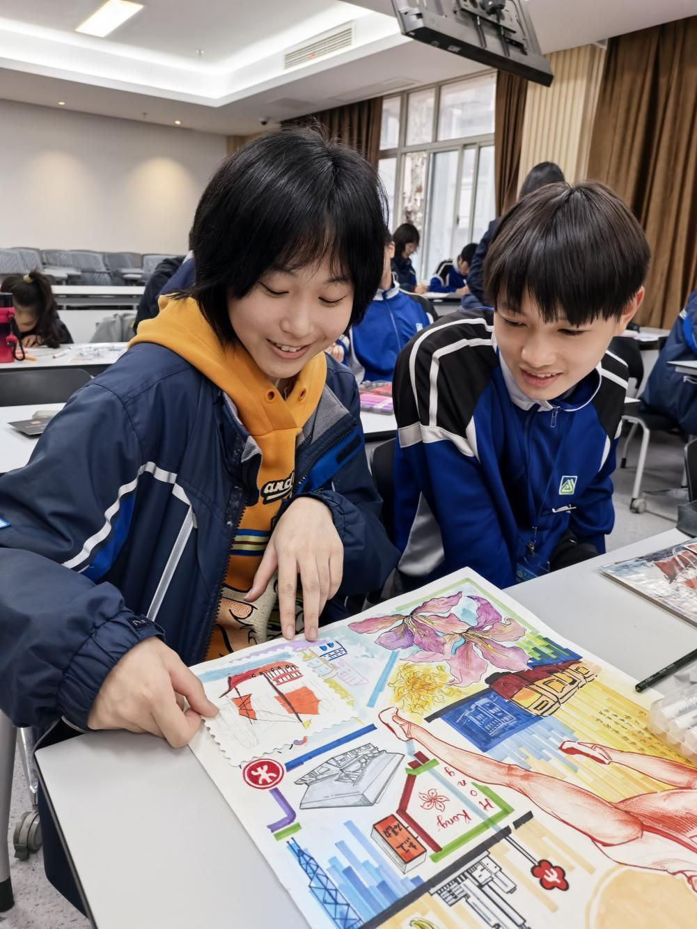 Furthermore, Feng Hing Yat, a Secondary 3 student, noted, "I was deeply attracted by the strong artistic atmosphere at Nanjing Ninghai Middle School. Masterpieces of calligraphy and painting were everywhere on campus." Under the guidance of art teachers, students from both schools worked on a theme titled "The Pen as a Letter, Ink as Emotion", sketching Hong Kong's vibrant life on stamps and condensing their shared aspirations on a single canvas.